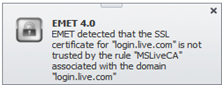 If the root CA certificate differs from the via EMET configured root CA, a warning message is displayed (and an event is logged to the application event protocol). The warning might look like this: