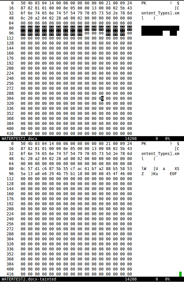 So it seems that there is some watermarking functionality included. If we look at the available functions there seems to be additional AES crypto involved. From the available functions we can also see that there is watermarking available for documents, images and even audio. By looking at the binary we were able to see that classic word documents are in the list of documents to be fingerprinted. So we thought we will give it a shot and created a simple DOCX file that we copied on a USB drive and attached the drive to the RedStar OS. Guess what: The MD5sum of the file changed. We did not open the file with the included “Sogwang Office” or touch it in any way, it just changed simply making it available to the OS. Now a DOCX file is basically a ZIP with multiple files included. If you look at a DOCX in a hex editor you will see that there are larger areas that are filled with null bytes at the beginning of the file. By looking at the same area again in a file that has once been transfered to RedStar we see some garbage inserted into the file.